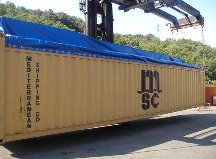 Si tratta di un tipo di telo universale per container open top di 20 o 40 ‘ realizzato in tessutto leggero PE 210 gr/m2. oppure in tessuto spalmato in PVC di 610 gr /m2. Destinato a coperture di merce speciale posizionata su container open top fuori sagoma. Secondo l’altezza massima della merce trasportata, proporremo una misura extra size determinata. Sono teloni sempre disponibili a magazzino.