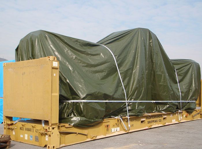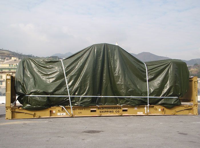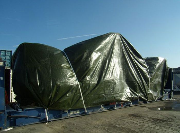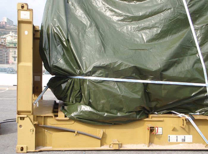 Realizzato in tessutto leggero PE 210 gr/m2. oppure in tessuto spalmato in PVC di 610 gr. fino a 900 gr / m2 (PANAMA). Destinato a coperture di merce ingombrante trasportata in FLAT RACKS o per coprire grossi macchinari. Abbiamo un ampio range di misure disponibili a magazzino, oppure possiamo fornire un telo rettangolare ed occhiellato disegnato a misura.